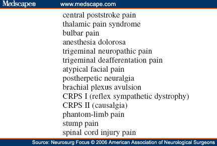 There are large differences in the incidence and prevalence of central pain among the various lesions and disorders that can lead to this problem. Because truly accurate epidemiological data are lacking, most figures represent estimates. Additionally, many patients have mixed neuropathic and nociceptive pain syndromes, and it is sometimes difficult to distinguish central pain from other potential sources in a given patient. The highest prevalence of central pain appears to occur after spinal cord injury and in patients with multiple sclerosis.[2] The percentage of patients with spinal cord injury and multiple sclerosis who experience central pain has been estimated to be 30 and 23%, respectively, and it has been estimated that more than 100,000 patients with these two conditions have some degree of central pain. Although the percentage of patients in whom pain develops after stroke is only approximately 1.5%, stroke itself is so prevalent that the actual number of patients in whom poststroke pain develops is quite large. Based on epidemiological figures for patients with spinal cord injury, multiple sclerosis, and stroke, Bonica[2] estimated the prevalence of central pain to be approximately 54 per 100,000 persons, meaning that approximately 130,000 individuals in the US with these conditions suffer some degree of central pain.