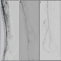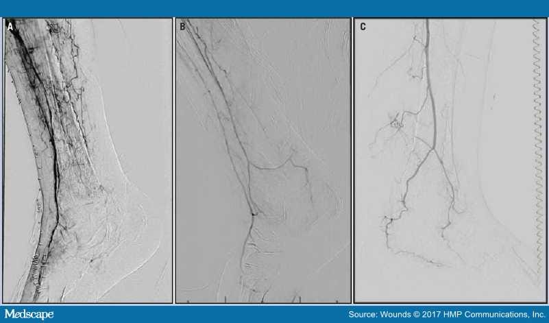 Three angiograms demonstrate situations involving heel tissue loss in which noninvasive vascular testing and the ankle-brachial index (ABI) may be misleading. (A) A patient with only anterior tibial artery runoff into the foot without any direct or indirect perfusion of the heel. Because the ABI ratio is conventionally calculated using the higher of the anterior tibial or posterior tibial artery values, it is possible a normal pressure and ratio could be calculated based on the anterior tibial artery, even though there is no perfusion to the heel; (B) a patient with antegrade flow through the anterior tibial and peroneal arteries. The primary flow to the heel is likely via the peroneal artery, which is not generally measured with ABI; and (C) a patient with only peroneal artery single-vessel runoff, which would not likely be measured with the ABI.