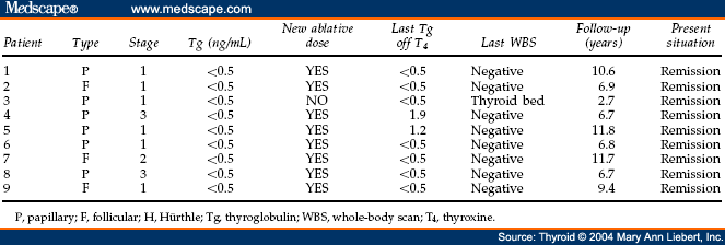 Cite this: Prognostic Value of Thyroglobulin Serum Levels and 131I Whole-Body Scan after Initial Treatment of Low-Risk Differentiated Thyroid Cancer - Medscape - Apr 01, 2004.