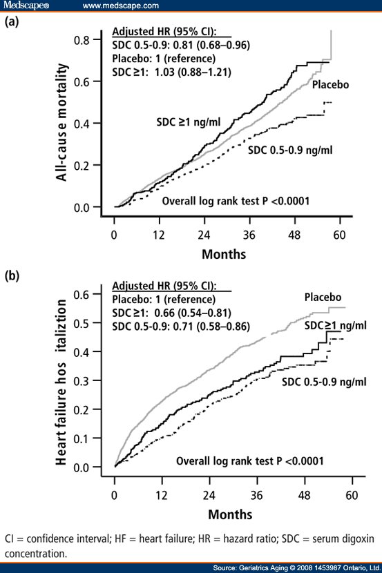 A comprehensive post hoc analysis of the Digitalis Investigation Group trial that included men and women with systolic and diastolic HF demonstrated that at low serum digoxin concentrations (0.5-0.9 ng/mL), the use of digoxin was associated with reductions in mortality and hospitalization.[25] Compared with individuals receiving placebo, those with serum digoxin concentrations 0.5-0.9 ng/mL had lower risks of death due to all causes (adjusted hazard ratio [AHR] 0.77, 95% CI 0.67-0.89) and hospitalization due to all causes (AHR 0.85, 95% CI 0.78-0.92). A repeat of these analyses using propensity score matching yielded similar results: the use of digoxin at low serum digoxin concentrations (0.5-0.9 ng/mL) was associated with reductions in all-cause mortality (hazard ratio [HR] 0.81, 95% CI 0.68-0.98) and cardiovascular hospitalization (HR 0.82, 95% CI 0.70-0.95)[26] Digoxin reduced hospitalizations due to worsening HF regardless of serum digoxin concentrations.