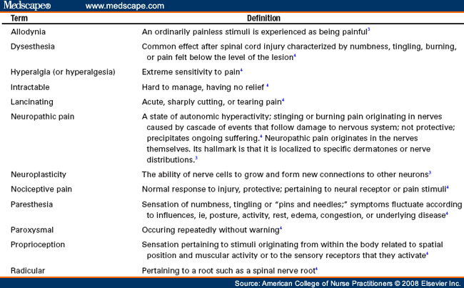 To better understand some of the mechanisms of neuropathic pain, a review of the types of pain, the mechanisms, the diagnosis, and the treatment of neuropathic pain is in order. Cadden describes three types of pain: acute, chronic, and acute on chronic.[2] Tom is experiencing chronic pain, which simplifies his care. When chronic pain sufferers have acute pain as well as chronic pain, they are at risk for undertreatment of pain. Table 1 reviews terms used to describe pain. There are basically three ways to treat pain: alter the central pain perception (inhibit mechanisms of pain perception in the dorsal horn of the spinal cord"'how most narcotics work), modify the pain source, and block transmission of pain impulses by modulating the transmission of the pain impulse.[2] The last mechanism is the area in which we will focus.