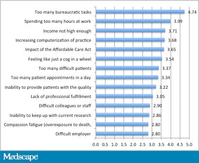 Too many bureaucratic tasks. In both years, "too many bureaucratic tasks" ranked first. Bureaucratic pressures and loss of autonomy are well-researched causes of stress in physicians.[12] It is worth quoting Robert M. Wah, president of the American Medical Association: "Physicians want to provide our patients with the best care possible, but today there are confusing, misaligned and burdensome regulatory programs that take away critical time physicians could be spending to provide high-quality care for their patients."[13]