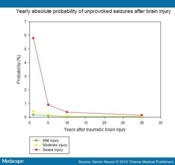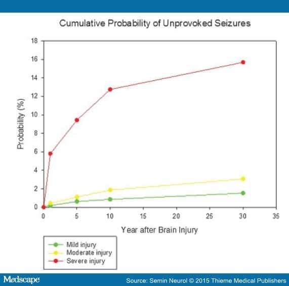 Clinical case series and population-based studies estimate cumulative incidence of epilepsy after TBI. The probability of developing late posttraumatic seizures in the entire sample of 480 persons with TBI in the United States was 13.8% at 24 months.[18] The cumulative risk of epilepsy among 2826 persons with TBI in China was 5.0% after 3-year follow-up.[19] The 30-year cumulative incidence was 2.1% for mild TBI, 4.2% for moderate TBI, and 16.7% for severe TBI in a cohort from the United States.[8] The cumulative probability of epilepsy among 137 persons with TBI in Italy was 10% at 6 months and 17% at 12 months.[20] The cumulative incidence of epilepsy among 3,093 TBI patients in China was 9.8% at 24-month follow-up.[21] Among 275 patients in England followed for a minimum of 4 years, 28 persons (10%) developed epilepsy.[22] The absolute risk may be even higher in institutionalized persons (25% after 12-year follow-up)[23] and combat brain injury (42% after 30–35-year follow-up).[24]