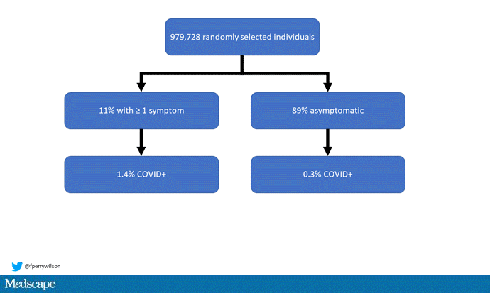 But the math here is quirky. Since symptoms are rare in the general population, the majority of the COVID cases were actually in asymptomatic people.